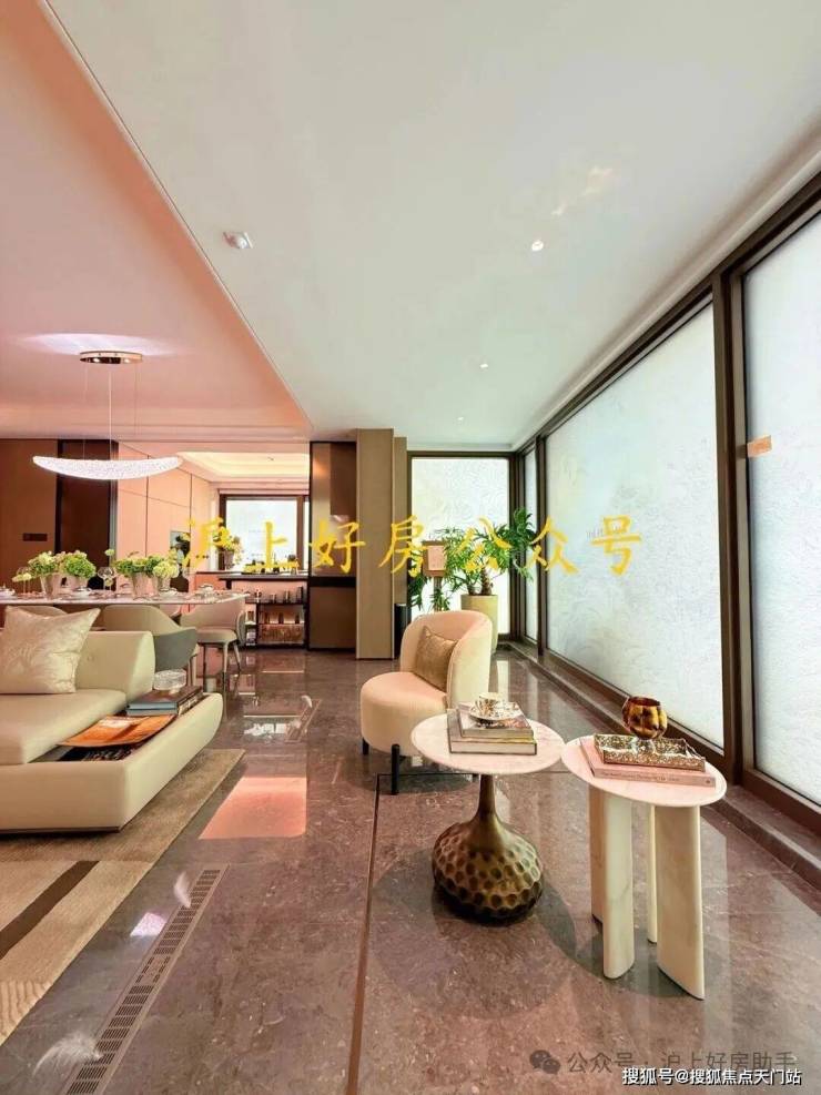 餐客厅面积约93㎡、进深7.6m; 客厅无界阳台,对望上海地标天际线;