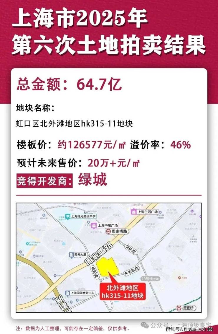 回溯至 7月25日,在上海第六批次住宅用地集中出让活动中,绿城集团以64.7亿元人民币的总价成功竞得该地块,地块溢价率高达46%,折合楼面价约为12.66万/㎡。