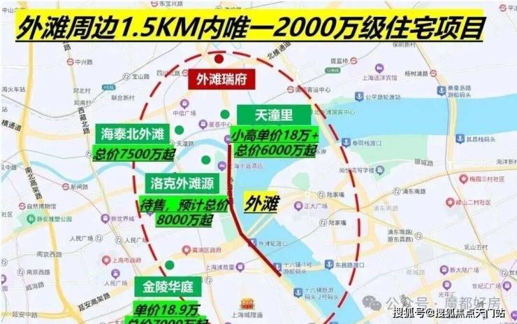 比如金陵华庭,步行到外滩约1公里,和「外滩瑞府」到外白渡桥距离相近,单价直奔19万元/㎡。