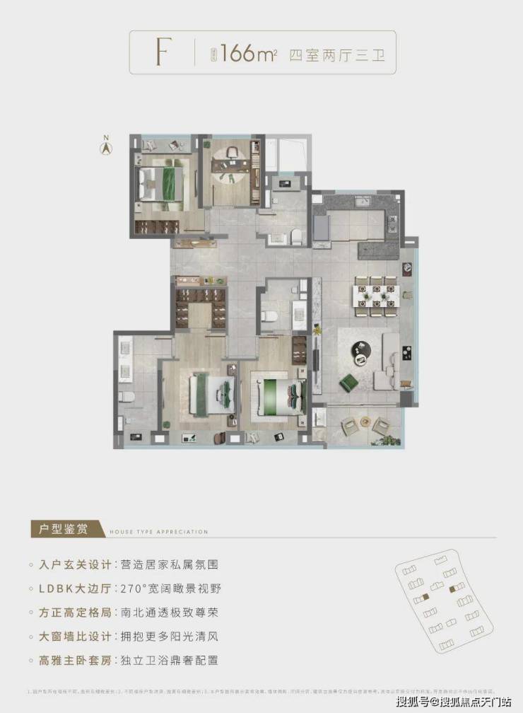 建面约166㎡4房2厅3卫,做到了3+1开间朝南+双套房设计+卫生间干湿分离,是“一步到位”的进阶改善4房!