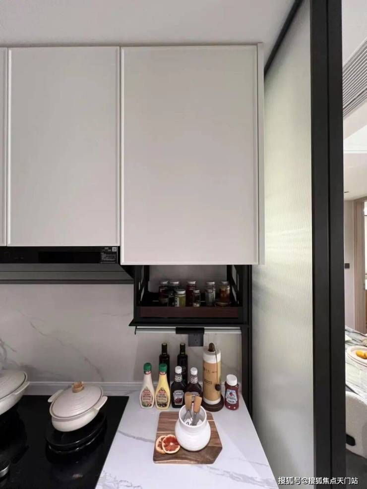 灶台旁更设计了一个下拉式的调味拉篮,轻松拿放的同时,也避免油渍沾在瓶瓶罐罐上。