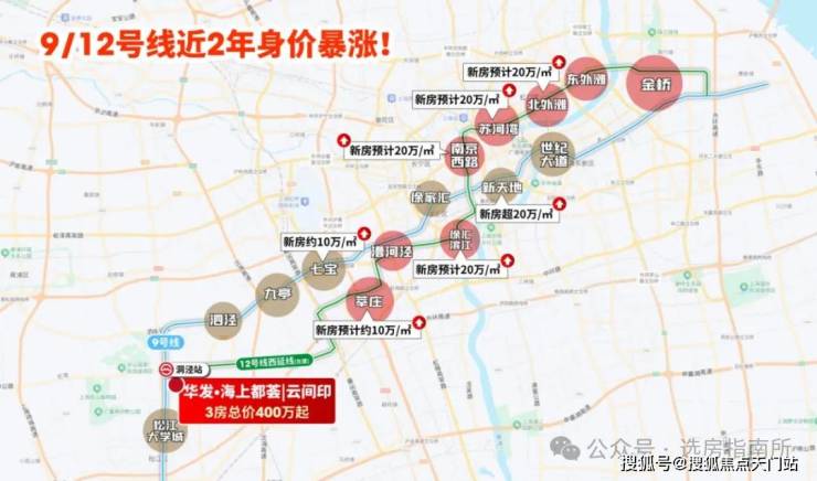 一条在建的12号线西延伸段, 串联起老静安、苏河湾、北外滩多个重要商务区,拥有多达13个换乘站的“地铁换乘之王”。25年12号线沿线的房价暴涨,项目作为12号线延伸段的关键枢纽,价值也随之高涨。