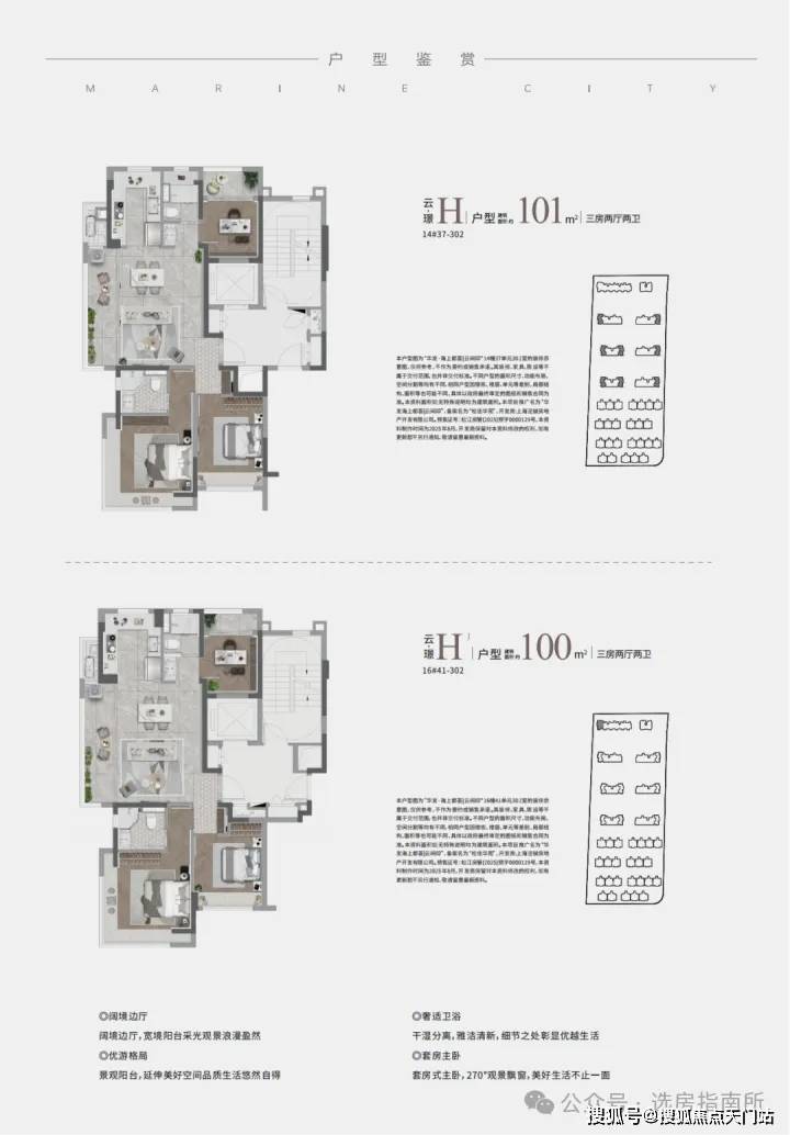 LDK客餐厨一体、在百平户型段引入南向双联阳台与独立功能阳台,主卧配置270°的L型环景飘窗,年轻小夫妻居住首选!