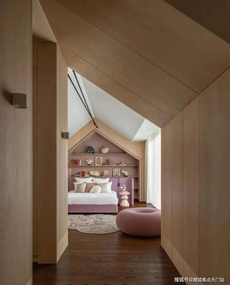 四层阁楼是大女儿的卧室。这里的斜顶启发我们在空间内打造了一个木质小屋;配备私人浴室和衣帽间,还有一个露天阳台,仿佛这充满阳光的一层就是个独立公寓。