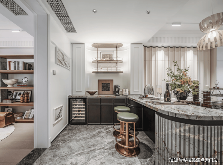更好更奢的归家门庭,嘉佩乐酒店风格,海派元素充满空间的每一个角落,地面的复古花纹,金属镂空装饰墙,普拉达绿的奢石点缀,仿佛穿越到了摩登时代!