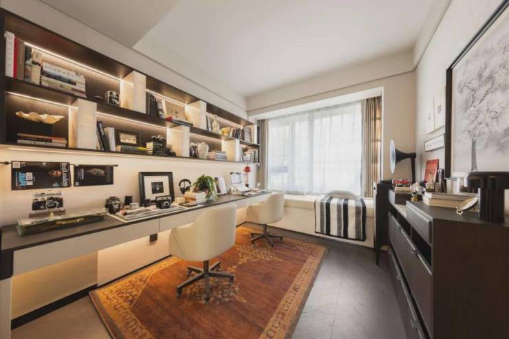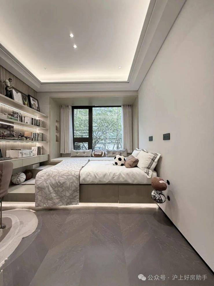 其中主卧的270°转角飘窗就有约5.7m²,通过与外立面的结合,直接做了梳妆台和储物柜,拓展了飘窗的实用性。