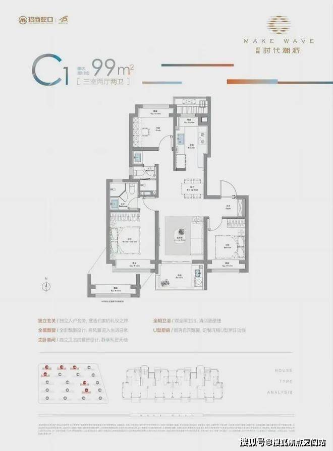 建面约99㎡户型为经典的飞机户型,客厅两侧卧室,三代人起居各有天地,私密无干扰;减少走廊,空间使用率高;独立入户玄关,从容收纳,更讲究居家的私密性;全屋房间做到飘窗采光,全部明卫,堪称教科书级别的设计。