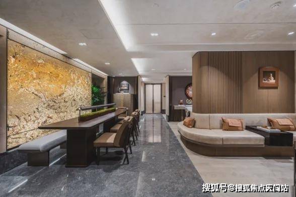 酒店式的社区大堂:精致的迎宾水景、苍劲滴翠的罗汉松,为城市的界面,增添一抹亮色,也让当代年轻人,在享受现代都市生活的同时,感受到家的温暖和亲切。蓝翡翠的奢石,以深邃幽远的尊蓝色基底,尽显光彩下的神秘奢华;而顶部异形的仿铜星空顶设计,用香槟金色斜角造型铝板搭配熠熠灯光,碰撞出科技与艺术的美学。