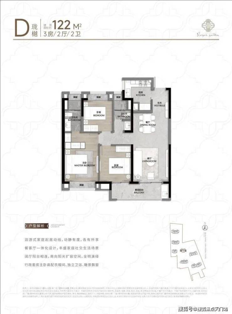 104㎡3户型特点:该户型多为楼栋的 东边套,是一个观景户型。客厅连接270°阳台,视野出众。双卧朝南,阳光满溢。从次卫布局看,如果家庭人口较少,该户型还能做成双套卧。