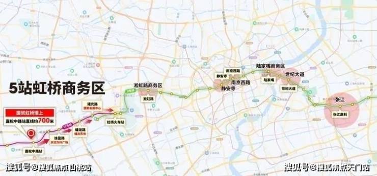 从嘉松中路站出发2站即到徐盈路站(天空万科广场)、3站蟠龙路站(新开业的蟠龙天地)、4站诸光路(国家会展中心)、5站虹桥火车站(虹桥商务区)并无缝换乘2号线。