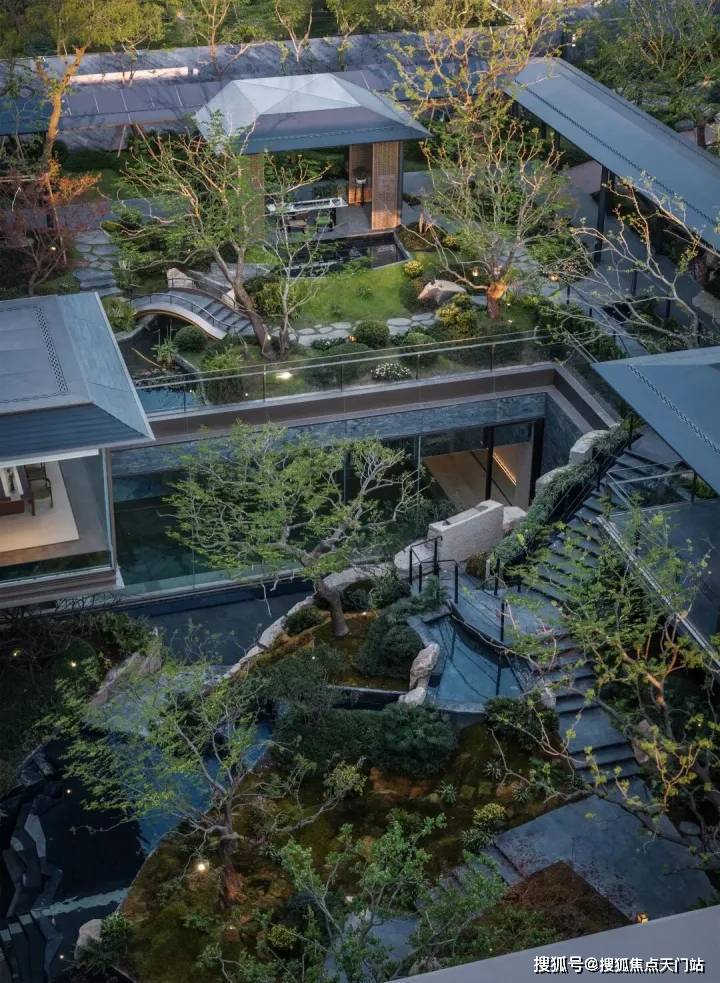 近460㎡的下沉式庭院, 精选太行山金景石堆叠成小山丘,溪水,并移栽岭南珍贵的古桩铁冬青和中华原生乌桕树,寓意“聚财守业”!