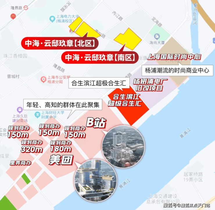 中海·云邸玖章距离江岸直线距离仅约500m ,作为当下片区内离江最近的项目,享美团、B站、 超级合生汇 等地标综合体配套,杨浦滨江生活中心。
