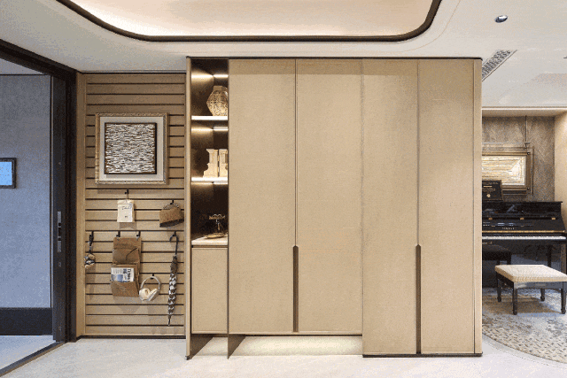 在收纳系统上,构建了涵盖玄关“多功能条板收纳墙”