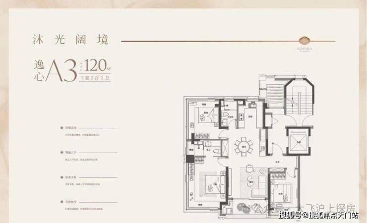 户型特点:边套户型,3开间朝南,方正格局。客餐厅一体化设计,餐厅空间宽敞,客厅进深较短但可通过与阳台连通优化空间感。全屋飘窗设计,边套南北卧室为270°转角飘窗,采光充足。独立电梯厅约7-8㎡,可改造为玄关或收纳空间。