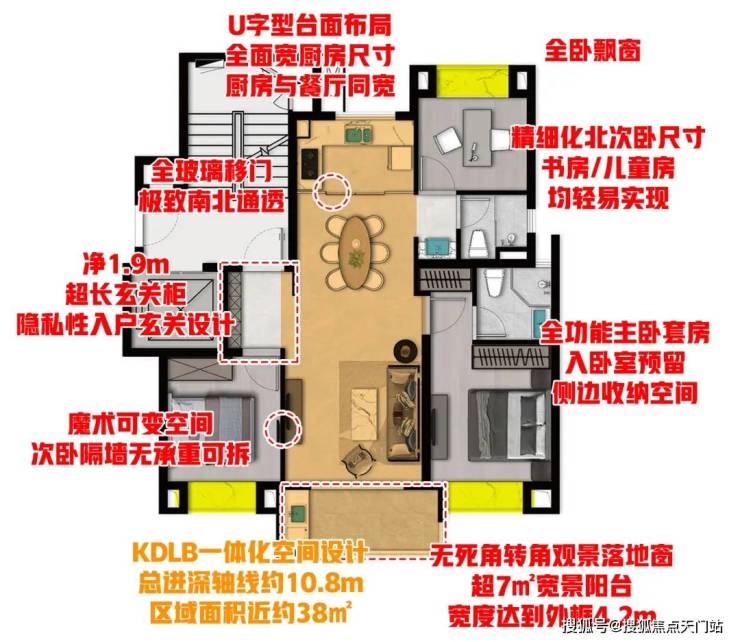 入户玄关及超大玄关柜设计, 三开间朝南飞机户型, KDLB一体化设计, 客厅次卧魔术可变空间, U型厨房, 大尺度宽景阳台+转角观景落地窗, 舒适北卧, 三段式干湿分离客卫, 全卧室飘窗,等等