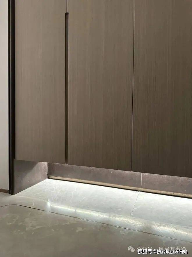 入户玄关处的地面,大理石地面搭配金属线条勾勒出玄关地界,归家的氛围感从这个区域就开始了~这还不是重点,玄关座椅背后,是一面 皮革包裹的墙面。鞋柜下方做了 悬浮处理,同样也是 内嵌灯带,这里灯光的角度还会再调整,因为灯光映射在大理石地面上,要显得尽量柔和不刺眼;同时,鞋柜下方可放拖鞋,还能放扫地机器人,便于日常清扫打理。鞋柜的饰面, 纹路方向统一,呈现出极强的协调感。橱柜作为强功能性的收纳系统,自然少不了操作性能上的考究,吊柜做了 升降式的拉篮,以后再也不用爬上高凳拿取了。下方的橱柜则做了 转角拉篮,充分利用转角空间,使物品井然有序的同时,轻松方便取放。水槽也是一个 大单槽,放得下炒锅汤锅这种大物件~ 抽拉式龙头,清洗大水槽的时候很方便,360度旋转伸展自如,这款弯管还是 硅胶材质,柔软耐用有弹性,还可切换出水模式,出来的水柱也是很柔和细腻不飞溅。厨房玻璃门是 上轨道移门,意味着地面部分没有任何轨道,不会有灰尘积攒,炒菜时关上,避免油烟散入室内;平时拉开,可以扩充室内视觉感受。 卫浴缦云上海所有户型的所有卫生间里都用了悬浮式的洁具和柜体,确保了下方空间的打扫无死角,对未来的入住带来非常大的便利性! 吉博力同层排水技术,静音是最大亮点; 特制“水母”地漏,多重防臭防反溢。干净舒适的卫生间,是从空气到水流的全面把控~你们可以看下缦云上海是如何处理卫生间木门的防潮的—— 卫生间一侧用大理石做踢脚线,这是真正细致入微的巧思!主卧卫生间配备的 电热毛巾架简直就是遇到潮冷节气的“福音”,让毛巾、内衣都能够提前加热干燥。 层高对于缦云上海的纯大宅社区定位,能买这样产品的购房者会非常在意空间感。缦云上海全部 户型层高约3.3米,室内所有空间的门都做了 通顶设计,更阔绰的居室空间,将生活格局有效放大,通风、采光和观景体验的全方位提升! 弧形元素缦云上海样板间里随处可见柔和的圆弧修饰,特别是柜体、墙体包边的 圆弧转角,在进出各个空间时,减少磕碰的风险,对于有孩子和老人的家庭来说,是非常实用的友好设计。而且,门套做了弧形设计后,还叠加了金属线与墙纸做了分割,加强隔断界限感,提升室内家居精致度~比起中规中矩的直线,弧形施工工艺更复杂、造价更高,却多了几分灵动轻盈!这种弧形的元素不只是在样板间里,在售楼处也能经常看到,比如电梯厅。