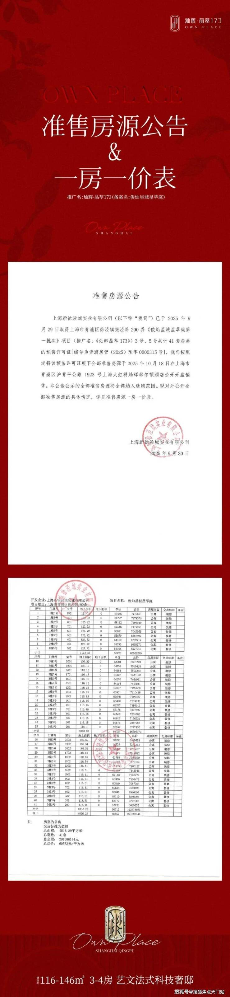 最新消息,一房一价表发布!大虹桥徐泾「灿辉晶萃173」10.7开始认购!推出建面约106-124㎡三房,均价6.05万/㎡!