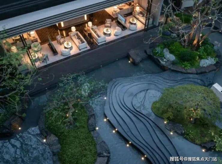 而实景首开的近2000㎡下沉庭院,作为“园林灵魂”,漫步此间,你会看见:乌金原石围合的“玉扣绿岛”上,低调静放着团队自“天下玉源”河南南阳历时遴选而来,近7000年的“国玉”独山璞玉,与山野林木共此氤氲灵气,尽显东方温润;从诗经走出来的近11m高参天乌桕,则再现古诗中所描述的“秋林城郭画图中,乌桕千株照眼红“的诗意;采用约6.7m幻影蓝奢石打造的“叠级水瀑”跌水台,池底以呈现天然墨绿色泽的蓝金刚石铺就,映水之澄明,境之悠远;连台阶都采用了“黑色花岗岩之王”安哥拉黑整石,沿云梯而上,让人返璞内心东方......
