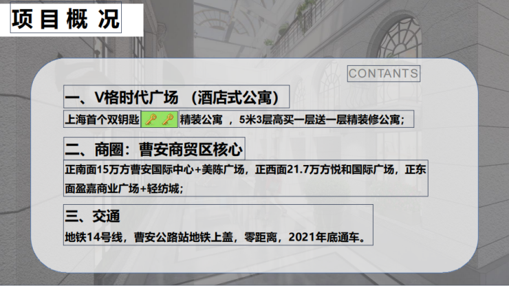 项目说辞:总占地1.8万方,总建面3.2万方,由1.5万商业中心加3层4层220套层高5.3米精装公寓组成,2022年1月30日交付
