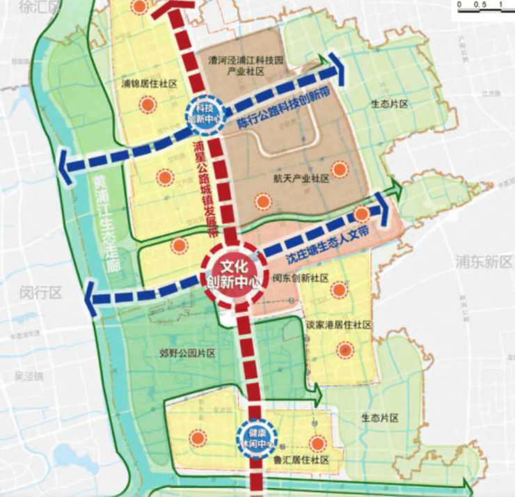 在2035规划中将浦江镇定义为闵行中心城区,打造“一廊三带三心”空间布局,依托得天独厚的生态资源及完善配套定义为“生态宜居板块”以及生态创新研发服务中心。