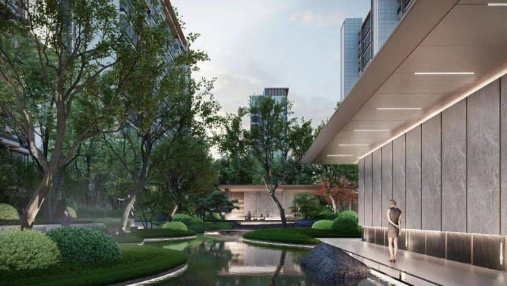 另外,项目还打造了一纵两横森氧艺境城市社区,其中涵盖了约400米无界宽景自然艺术轴、约460米流动的江之界森林界面以及约240米社区街心焕活轴。