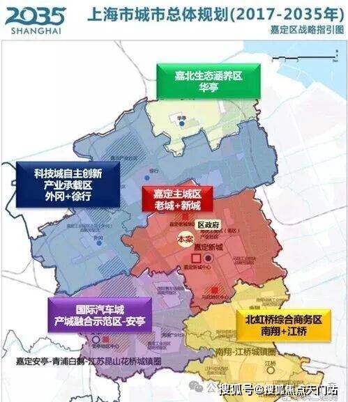 嘉定规划形成“一核四区”功能布局:嘉定主城区是核心,四区是指虹桥综合商务区(也就是南翔和江桥)、科技城自主创新产业承载区(徐行和外冈)、安亭国际汽车城产城融合示范区、华亭嘉北生态涵养区。