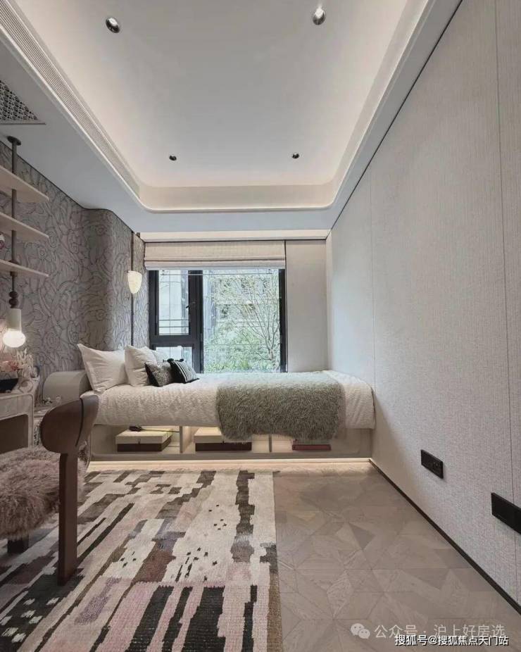 电视背景墙采用卡慕白的石材+皮革造型,弧形吊顶,相当讲究,连空调出风口的形状都打造为海上·清和玺logo山茶花的形状~~三大件为大金(或同等档次)中央空调和地暖,新风系统为百朗(或同等档次),南向阔景阳台,采光视野一级棒!