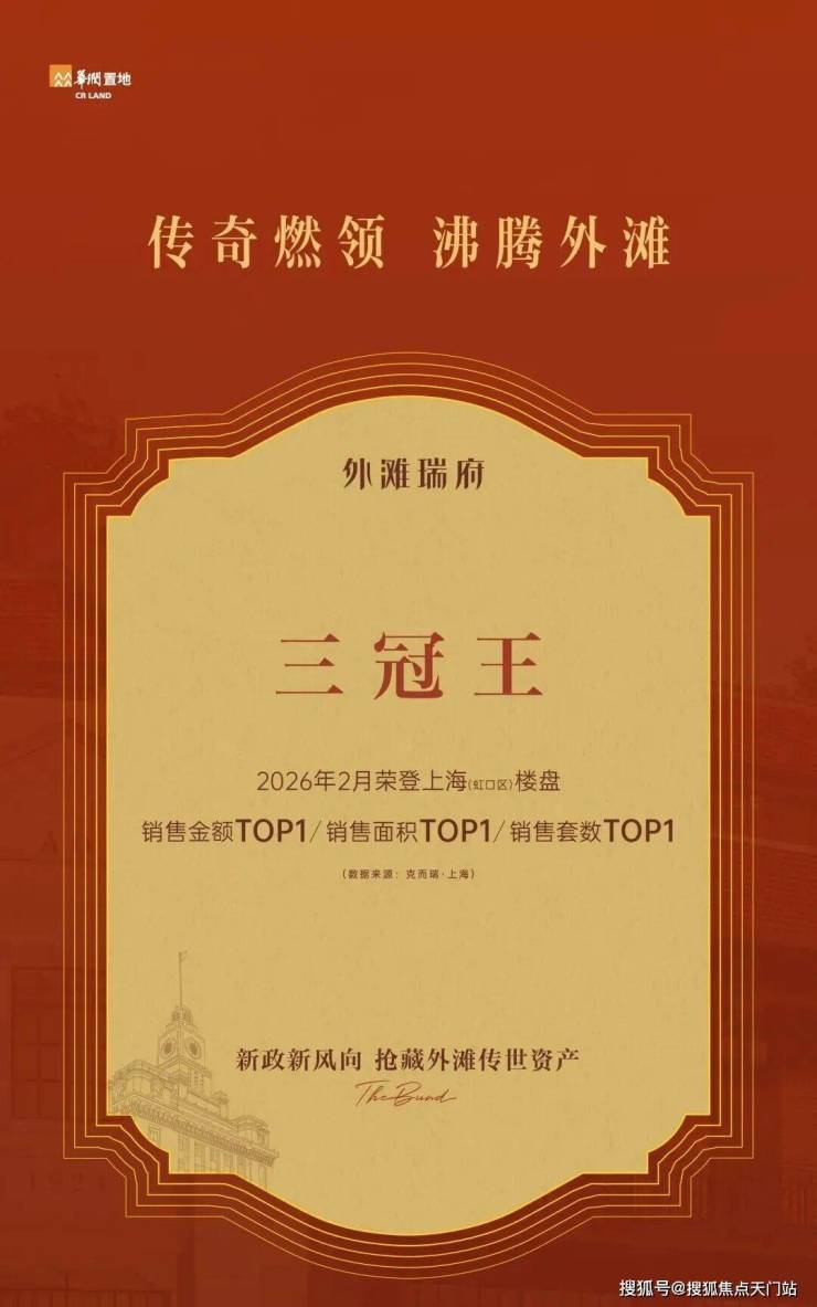 而如果你把时间再往前推到2月,会发现这并非偶然——外滩瑞府一举拿下虹口区楼盘销售金额TOP1、销售面积TOP1、销售套数TOP1,成为当月虹口“三冠王”。