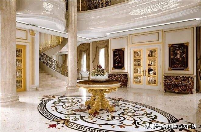 入户门厅比普通豪宅的客厅还要大,客厅的 两根罗马立柱 让这个空间满满都是仪式感。