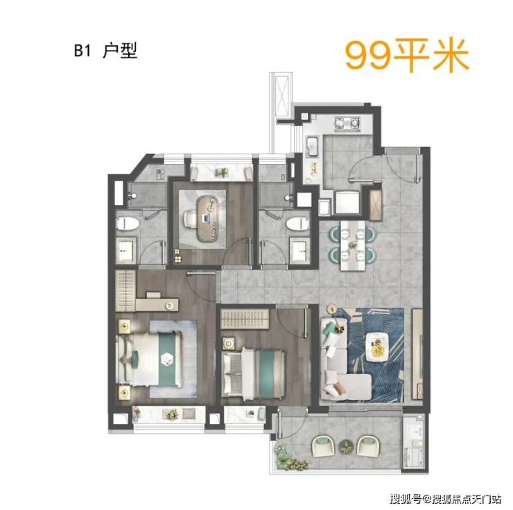 三卧舒适度均衡,均能做成完整卧室,避免了市面上99㎡普遍“2+1”的现象。