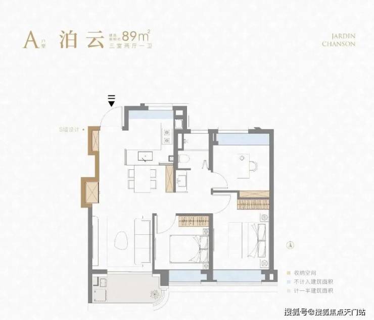 建面约89㎡3房户型,利用科学的收纳和S墙设计保障了室内空间的井井有条,又通过大量飘窗和阳台等提升尺度感,厨房也附带飘窗。