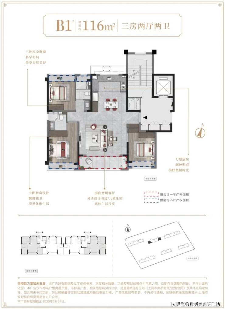 116m²户型特点:三卧室全飘窗 ,科学布局,悦享自然美好, 南向宽境客厅 ,灵动设计书房/儿童乐园,延伸生活尺度, U型厨房 ,阔绰明亮,美好私厨时光, 主卧套房设计,飘窗独卫 ,境见优雅生活。