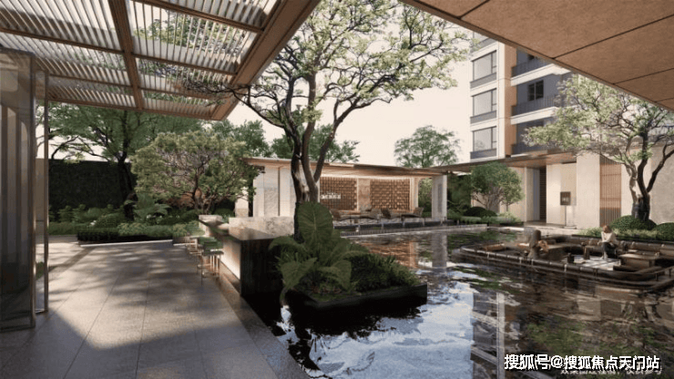 整个社区打造了 “两轴、三带、六园”的景观结构,环环相扣、交相辉映, 约160m的中央花园轴,以翠影草坪为核心,串联尊享迎厅、水榭林涧、星际乐园、悠活天地等功能空间,将公园生活引入自家社区,还有 五重归家礼序,以悦享门廊为核心,森活绿地无界相融,营造城市与家之间的松弛缓冲带,值得一提的是,整个园林设计中 大量应用爱马仕灰大理石铺装,不惜成本提升质感。