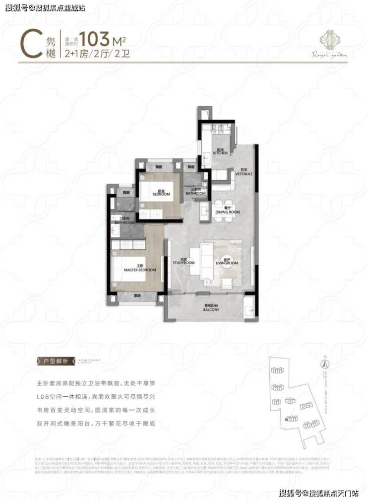 104㎡3户型特点:该户型多为楼栋的 东边套,是一个观景户型。客厅连接270°阳台,视野出众。双卧朝南,阳光满溢。从次卫布局看,如果家庭人口较少,该户型还能做成双套卧。