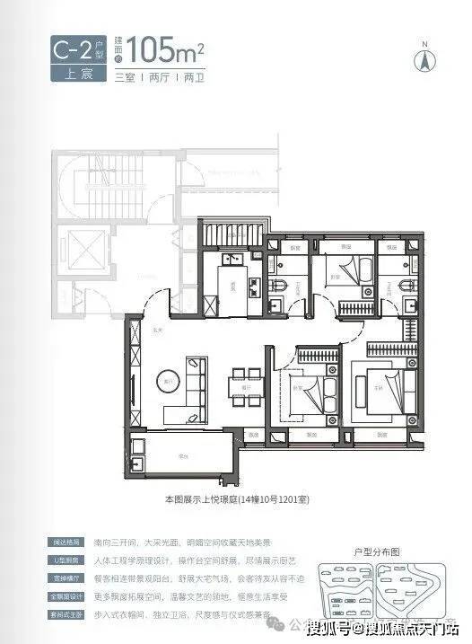 罕见宽厅设计:约95%的宽厅设计出现在120㎡以上户型中,而项目在约105㎡面积段就做了宽厅,非常难得,这个户型进入二手房市场将极具竞争力。