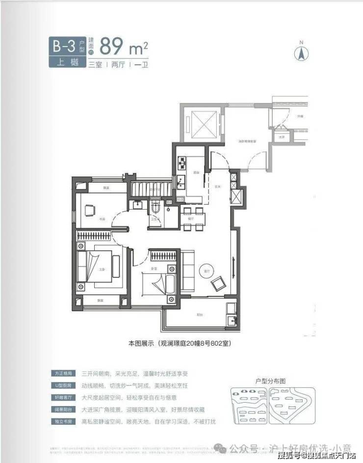 U型厨房、餐厅、客厅、阳台一线联通,南北通透。主卧套房、全卧飘窗、次卫干湿分离也都是标配。