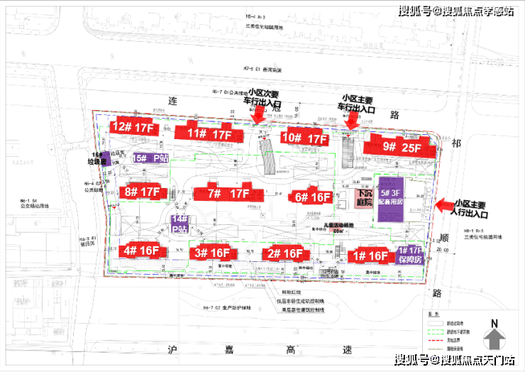 其中1号楼靠近17层的保障房,5号口为3层的配套用房;14#、15#为P站,16#为垃圾用房。