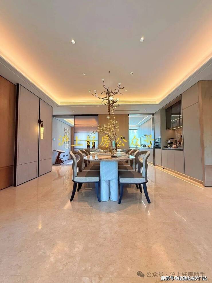 约17.2米环绕观景台:约238㎡户型的客餐厅,位于户型的顶端。自东向南环绕270度的观景台长达约17.2米,在这样的客厅,甚至可以踱步欣赏窗外的满眼梧桐。独立会客厅,可以做小茶室或棋牌,更深一步的隐私感,为专享客群定制。