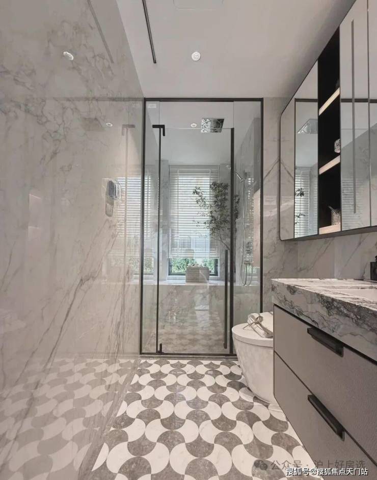 奢石台面,皮革饰面柜抽屉,侧端设置金属收纳开放格;定制镜柜,中间的透光玉石直接提升了高级感,镜柜内部配备了美妆冰箱+美妆灯条+轨道收纳!