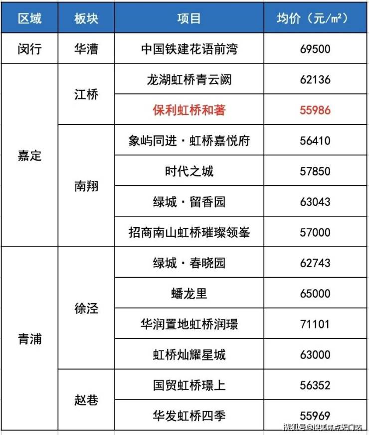 保利虹桥和著项目的均价 仅约55986元/㎡,堪称大虹桥板块最低价在售新房!与周边其他楼盘相比,价格优势十分明显。比如嘉定南翔的绿城·留香园 已高达63043元/m²;嘉定江桥龙湖虹桥青云阙也达到了62136元/m²。再看青浦徐泾的绿城·春晓园也达到了62743元/m²,蟠龙里更是高达65000元/m²。而闵行华漕的中国铁建花语前湾均价69500元/m²。