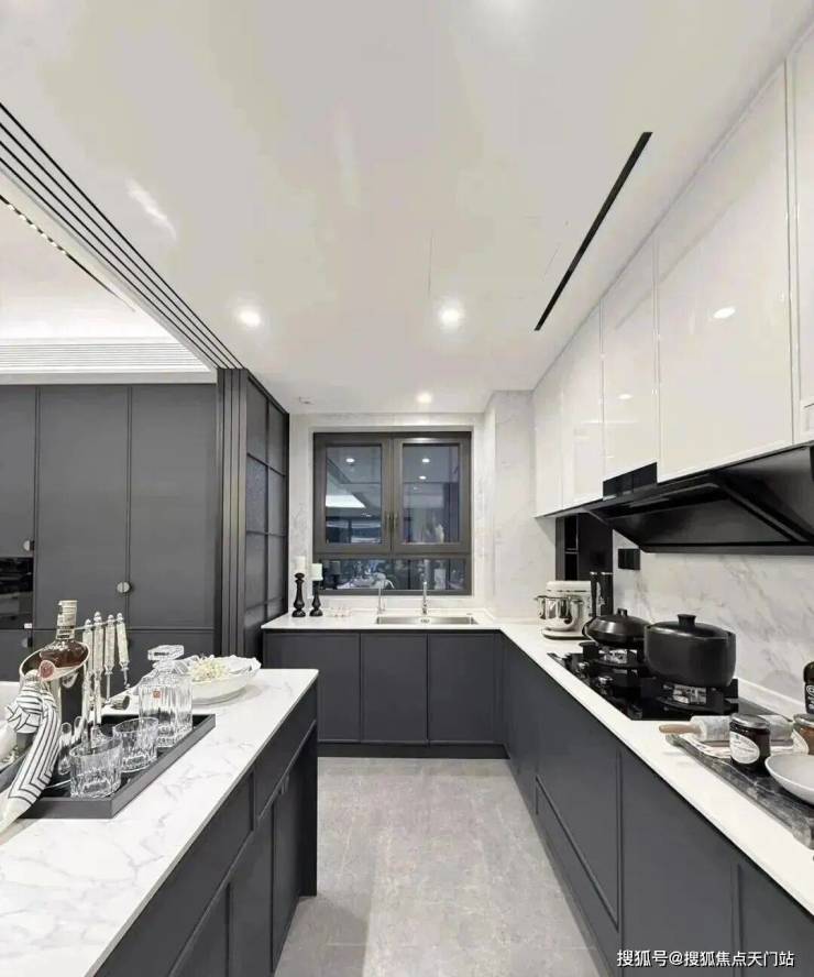 比如,厨房配了珍珠白吊柜、三组抽屉式拉篮合理搭配,调料架收纳、大容量踢脚抽、清洁用品收纳区,米面粮油、碗碟刀叉都可完美隐身。