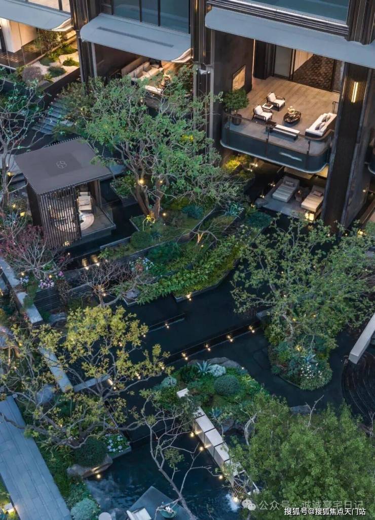 而在3、5号楼之间,则搭建了【围炉夜话】场景空间。古木纹奢石砌成的火炉旁,整木炭化石凳散发着山林野趣,一株红舞姬枫树翩然伴舞。冬日傍晚,好友围坐,体会名门温情。