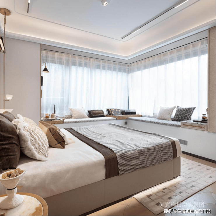 270°无柱飘窗的主卧套设计,打造出一座“空中观景舱”,将晨昏光影、四季流转尽数收纳,极大拓展了生活的视觉与心理边界,推窗即览美景,让居家时光更具诗意。