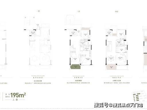 175-195㎡上叠:3-5 层二跃三立体格局,私梯入户,独享约 30㎡星空露台 + 中层悬浮庭院。三层层高约 3.35 米、四层约 3.55 米、五层约 3.1 米,全部标准层高无斜顶空间。四层为起居主层,两南一北卧室布局,北向卧室约 17㎡,双面落地窗采光。五层为客餐厅与长辈房,7.2 米超大面宽,空间通透。露台全赠送,可改造为空中花园、休闲区,边套户型 270° 采光,视野无遮挡。