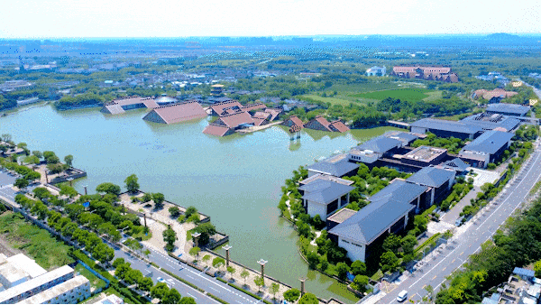 “富林十景” 不是草木堆砌:舟影桥复刻遗址古船弧度,茶庭青石板拼青铜器纹样,酒坊坞叠水声仿古法酿酒韵律。砖石、栏杆、路灯皆藏广富林符号,漫步其中如在江南画中。