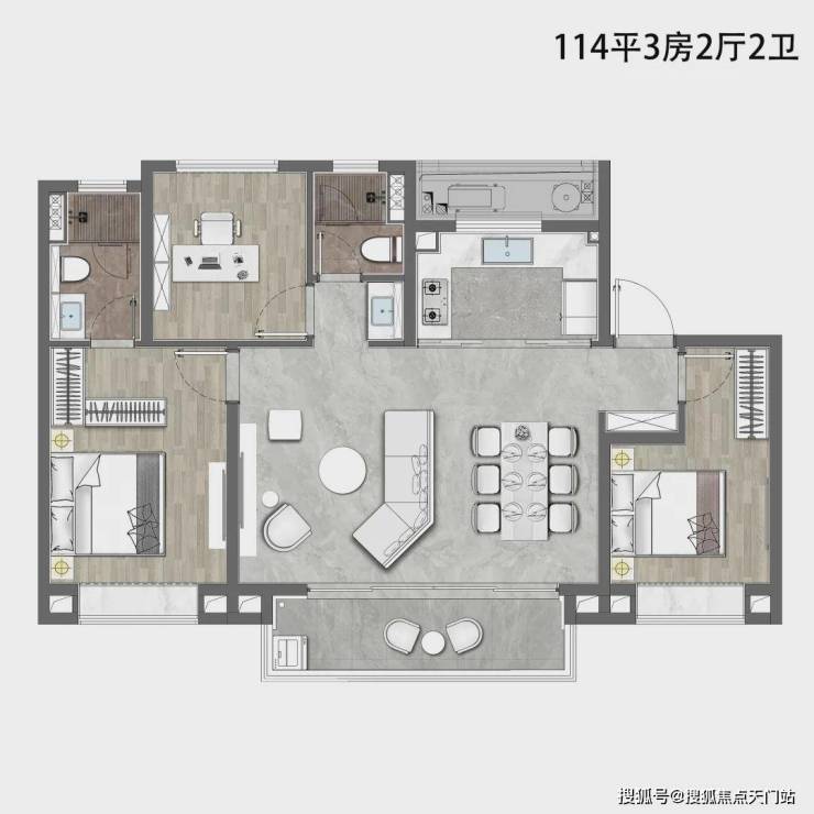 建面约114㎡3房2厅2卫户型▼
