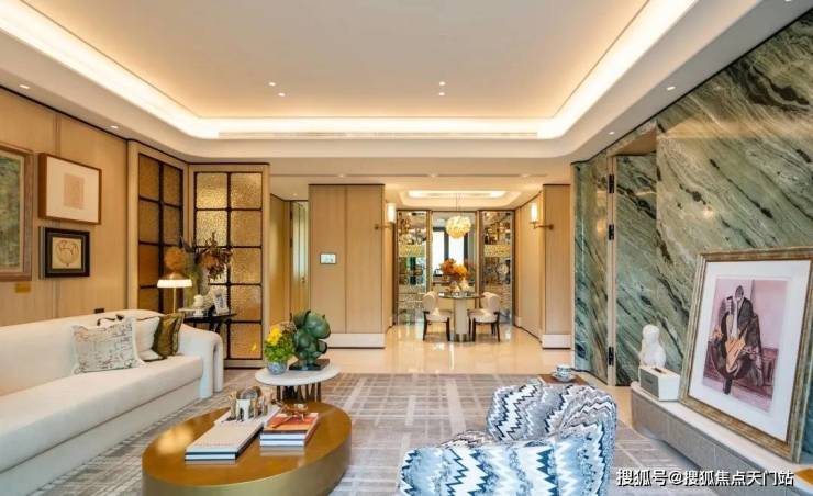 例如入户玄关铺设有“石材皇后”鱼肚印象,这种级别的奢石在很多项目中通常仅作局部镶嵌。