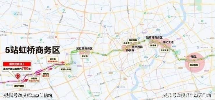 从嘉松中路站出发2站即到徐盈路站(天空万科广场)、3站蟠龙路站(新开业的蟠龙天地)、4站诸光路(国家会展中心)、5站虹桥火车站(虹桥商务区)并无缝换乘2号线。