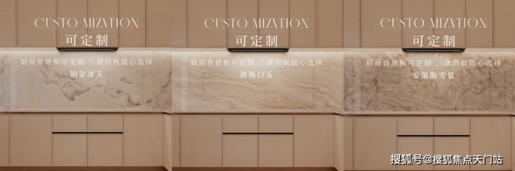 厨房背景墙可定制:背景墙为岩板铂金冰玉、波斯白玉、安第斯雪景三款可选,定制专属于你的大师厨房。