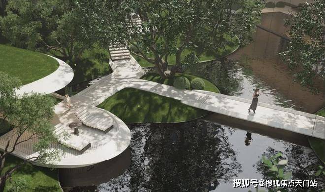 穿过园林,上海最大的约3500㎡下沉水院构成社区的核心灵魂,约13米的高差形成独特的“峡谷绿洲”,将黄浦江的水意象引入社区,中央平静水面与四周的会客舱、茶室、游泳馆形成呼应。
